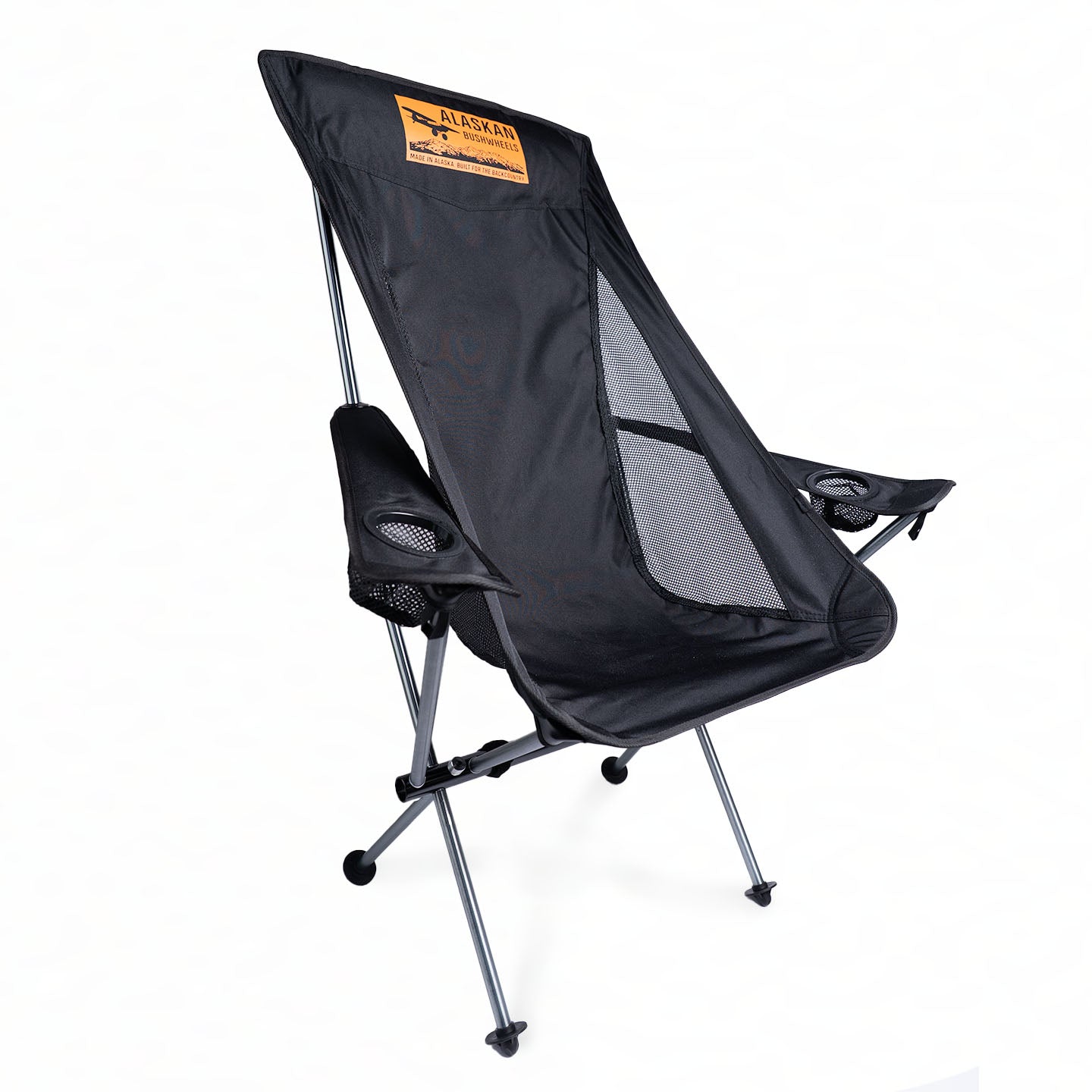 This Alaskan Bushwheels camp chair boasts a tall backrest and spacious seat, providing both durability and comfort for easy entry and exit. The aluminum frame and shock cord construction allow for compact packing and effortless assembly. The curved pole design results in a wider and steadier seat, promoting improved blood circulation and overall comfort. The included carrying case doubles as a convenient storage pocket located under the seat.