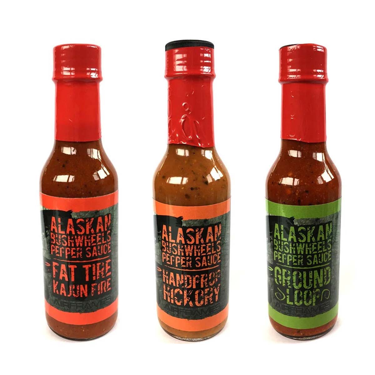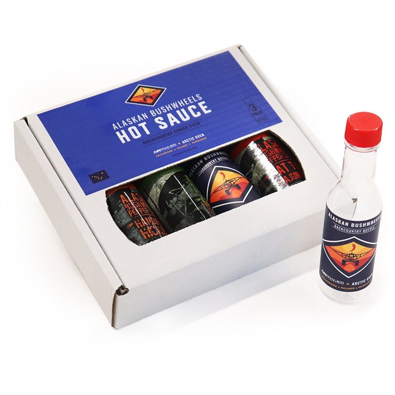 Add some Alaskan flavor to your meals with Alaskan Bushwheels hot pepper sauces (5 oz). Choose from tangy-spicy Ground Loop, mild Hand Prop Hickory, or classic Cajun. Try each on different dishes like eggs, chicken, brisket, pulled pork, wings, and seafood gumbo. Get them all in our convenient backcountry combo pack with an included plastic travel bottle.